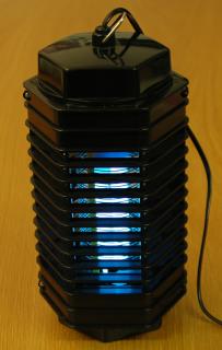 These are not elegant devices, but they get the job done. The principle couldn't be simpler—flying insects, whose compound eyes see long-wave ultraviolet light that mammalian eyes don't, are attracted by the lure tube, which appears to emit a dim blue light to humans. To reach the light, they have to fly between wires electrified with between 4 and 8 kilovolts which, when the insect completes the circuit, kill-a-bug.