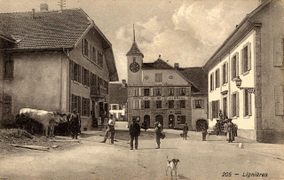 You can explore this transtemporal view of a small Swiss village either by taking our walking tour of several paths through the village, or explore on your own from the bird's eye perspective of the graphical index which allows you to click on viewpoints to see the village, then and now, from each. I have added comments to many of the pages to describe the location and history of the buildings in the picture. The abbreviation “RACN” indicates a structure's identification number in the 2006 edition of the Recensement architectural du canton de Neuchâtel published by the Office de la protection des monuments et des sites (OPMS) of the Canton of Neuchâtel, copyright © 2006 by the OPMS. With permission, all of the pages describing Lignières are included in PDF form on the DVD-ROM which accompanies the history book described above, and images of pages for structures which appear in this document are linked to their identification numbers.